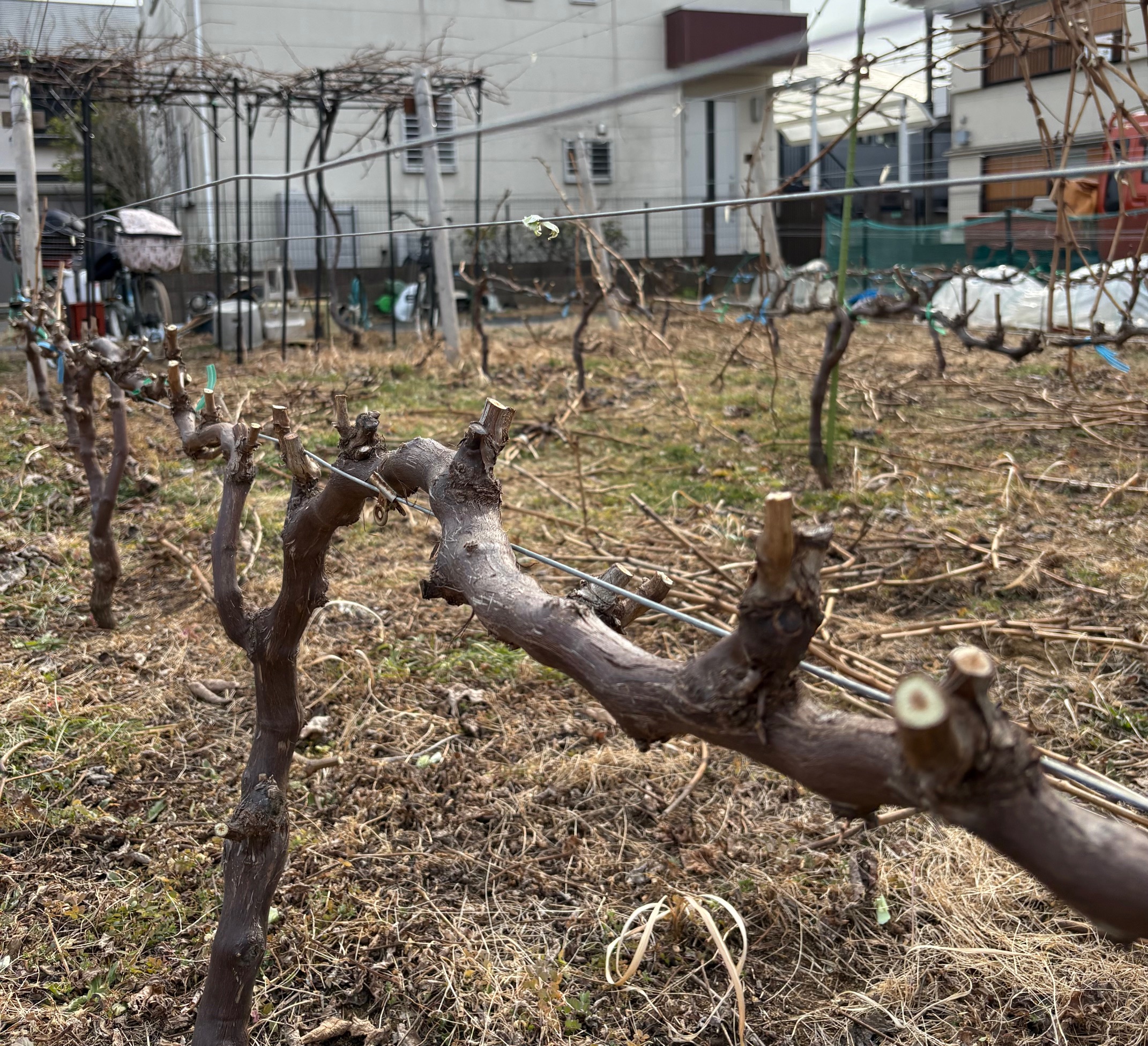 樹勢を見ては、横に這わす枝を決めたり、なかなか悩ましい作業です。