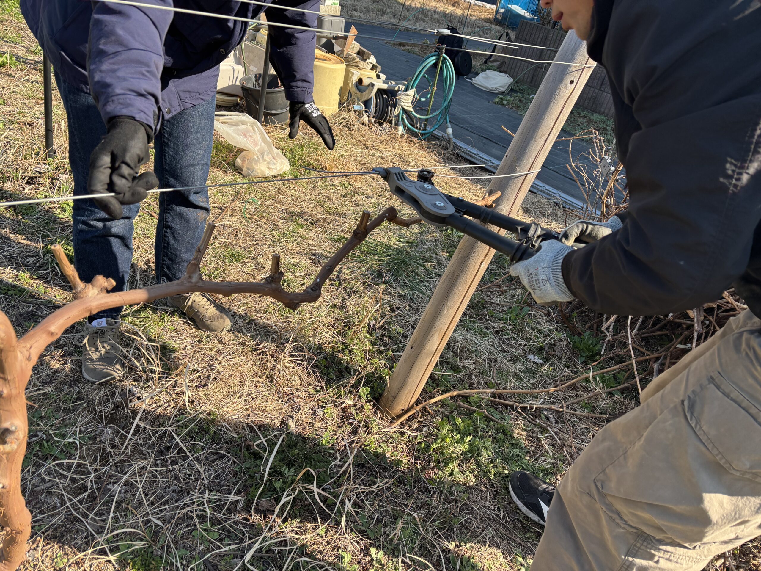 ぶどうの列の1番線(1番下の線)に緩みがあることと、番線の位置が通常より少し低いため、番線の位置を上げ、締め直しを行いました。