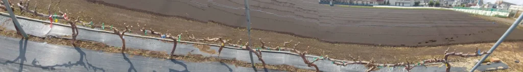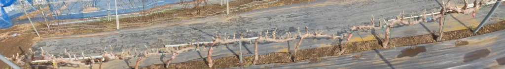 20260327 硫黄塗布 Blue 2026.03.29 3/27(金)9:30~11:30曇16℃微風1名 石灰硫黄合剤塗布完了 萌芽してませんでした。(萌芽していると葉が薬焼けしてしまうので芽の近辺には塗布しない)(H.I)