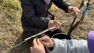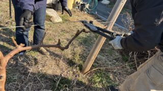 3/27(金)9:30~11:30曇16℃微風1名石灰硫黄合剤塗布完了萌芽してませんでした。(萌芽していると葉が薬焼けしてしまうので芽の近辺には塗布しない)(H.I)