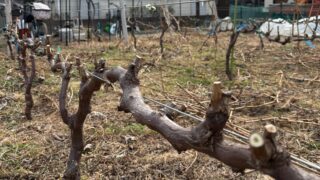 ぶどうの列の1番線(1番下の線)に緩みがあることと、番線の位置が通常より少し低いため、番線の位置を上げ、締め直しを行いました。枝を番線に留めているビニールテープをはずし、線を中央の支柱の下から2番目の穴に通し直し、端のところで機械で締め直し...